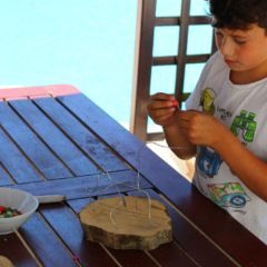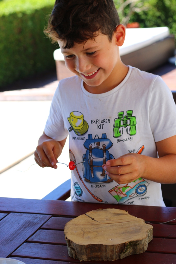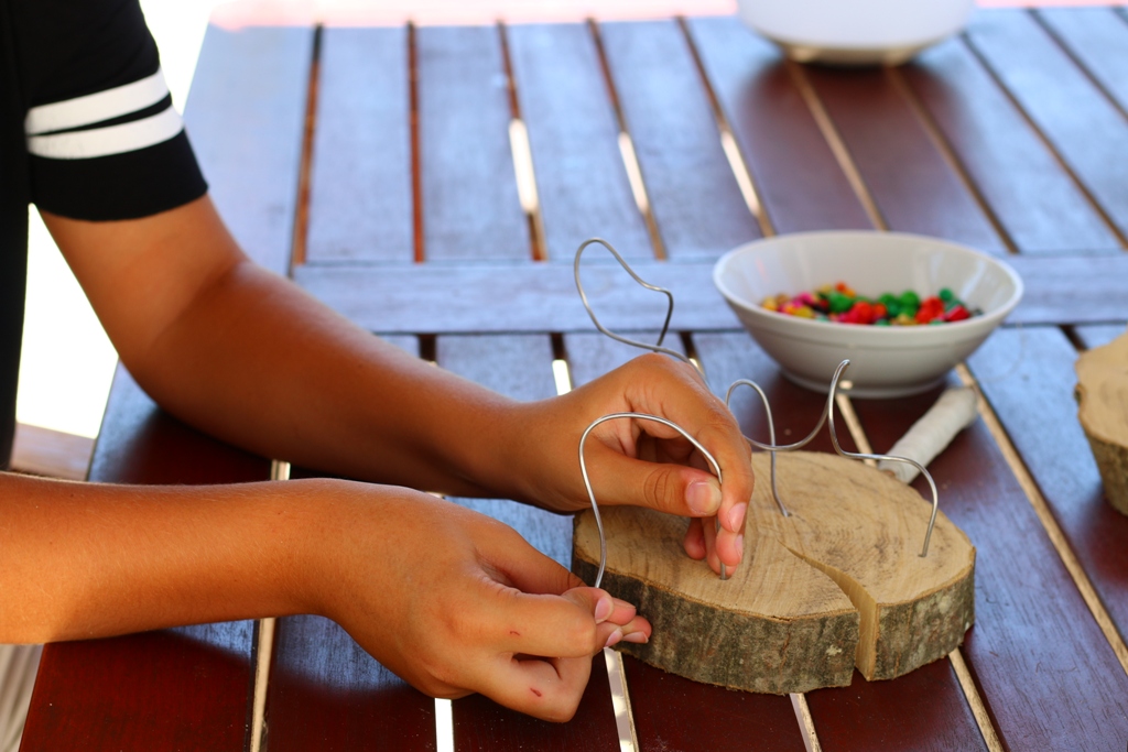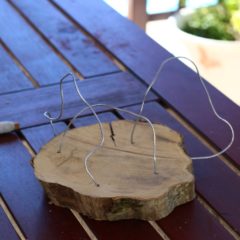 Korak 4 – I već smo došli do posljednjeg koraka – učvršćivanje žičane instalacije! Drugi kraj žice koji je ostao slobodan treba uglaviti u jednu od preostalih rupa u drvenoj podlozi. Ukoliko ste sigurni da vaš mališan želi da njegova skulptura ostane postojana, baš takvog oblika koji ne želi mijenjati, možete iskoristiti i vruće ljepilo i njime ispuniti rupu u kojoj je žica, kako bi ona ostala dulje vrijeme pričvršćena.