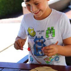 Korak 1– Sigurni smo da negdje u svojoj kući ili stanu imate osobu koja posjeduje svoj vlastiti kutak za alat kojeg čuva kao skriveno blago. Zasigurno vam neće zamjeriti ako na trenutak iz tajne škrinje posudite zlatni odvijač ili dijamantnu bušilicu kojom ćete u drvenoj podlozi napraviti nekoliko manjih rupa u koje će vaš klinac kasnije uglaviti metalnu žicu. Iako će vas vjerojatno vući za rukav i htjeti sudjelovati u ovom koraku, ipak predlažemo da ovaj postupak odradite vi „veliki“, a on uvijek može gledati i upijati znanje koje će iskoristiti kada ipak malo poraste. Mi smo imali već iskusne majstore (12 i 7 god.) koji su zanat odavno „ispekli“ :D, naravno uz naš nadzor!
