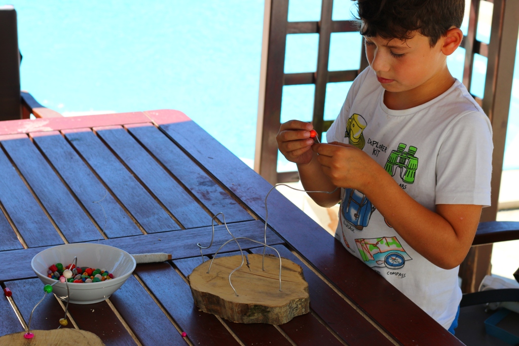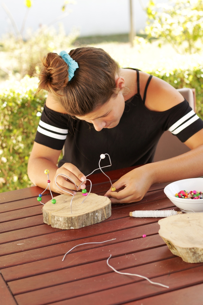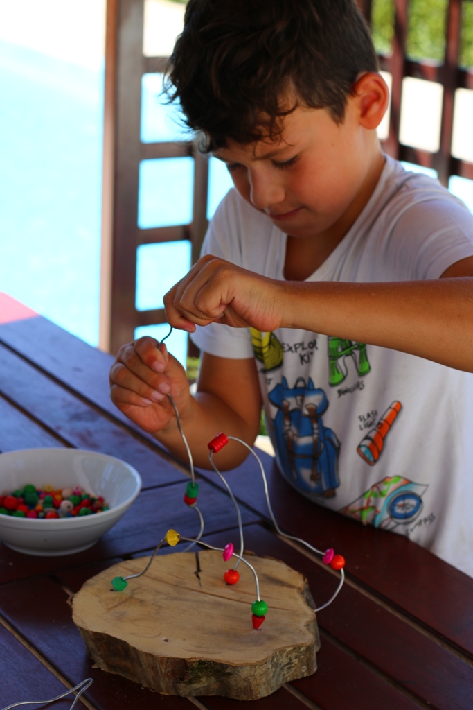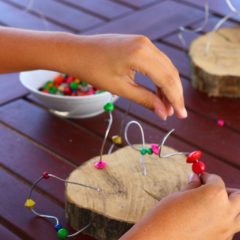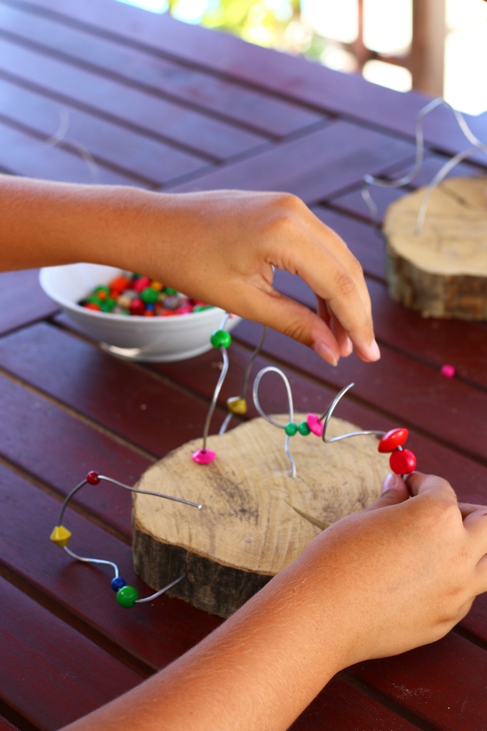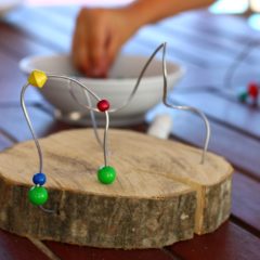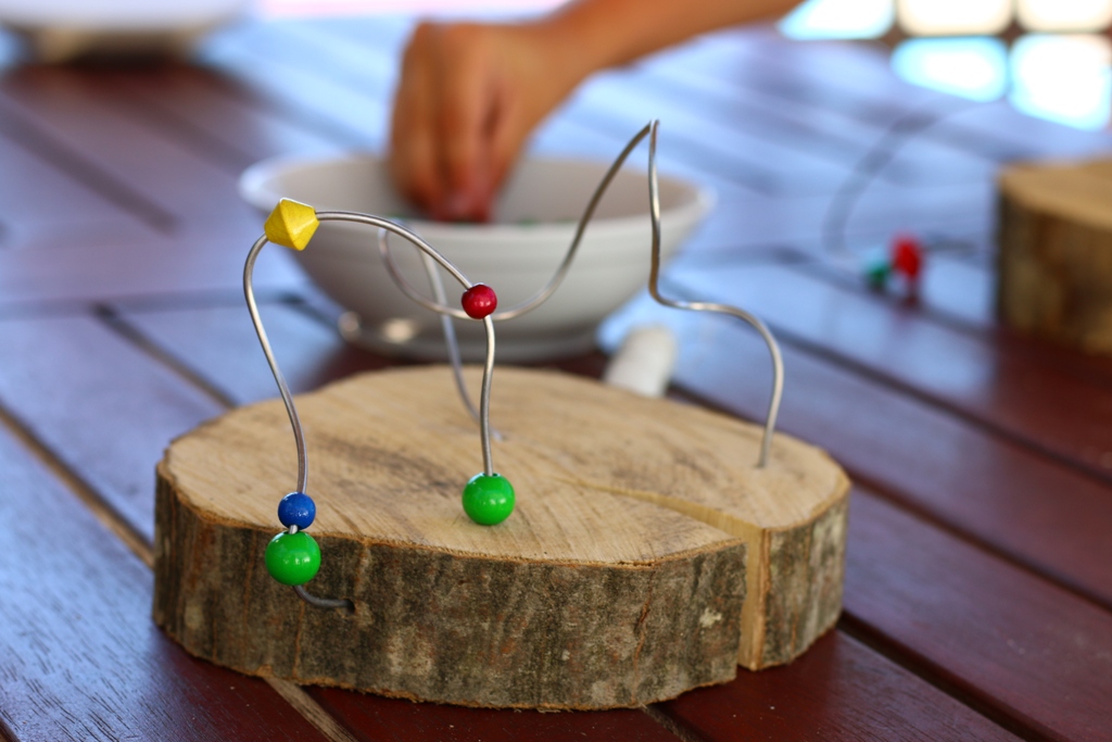 Korak 3 – Kako žice ne bi ostale „samo“ žice, već postale pravo umjetničko djelo, dovoljno je da svom djetetu ponudite hrpu različitih perlica, a ono će dalje intuitivno samo stvarati. Idući korak je nizanje perlica na žicu, naravno po želji i planu koje je vaše dijete samo zamislilo. Što više perlica, šarenih, različitih oblika i veličina – to bolje! Svakim nizanjem će vježbati pincetni hvat, koji je jedan od glavnih preduvjeta kasnijeg pravilnog držanja olovke!