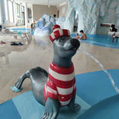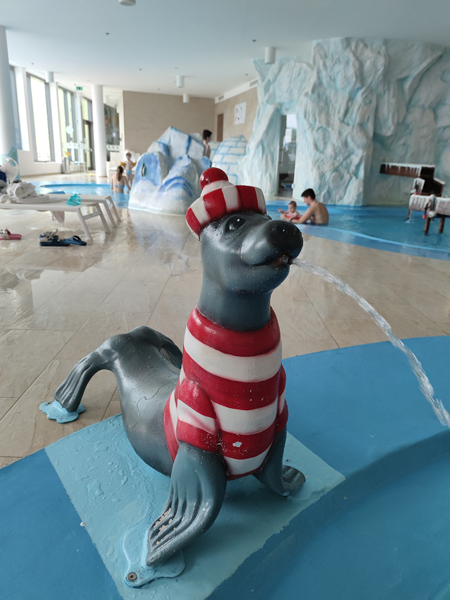 Evo nas i kod drugih voda! Na bazenima (i u bazenima) smo posebno uživali. Prije nego što smo uopće došli do njih, oduševilo nas je što je, uz nas dvoje odraslih, i Liv dobila svoj mali, slatki bademantil od nježnog i kvalitetnog mekog materijala. Tako full opremljeni stigli smo na bazen(e). Naime, family hotel Falkensteiner ima više vanjskih i unutarnjih bazena od kojih su neki potpuno i sigurno prilagođeni za bebe. Uključuju predivno uređeni, zabavni aqua park sa simpatičnim vodoskokićima u obliku životinja, male i velike tobogane te maštovite „stijene“ u stilu Ledenoga doba. Liv se jako svidio jedan morski lav i jedva smo je uspjeli odvojiti od njega!