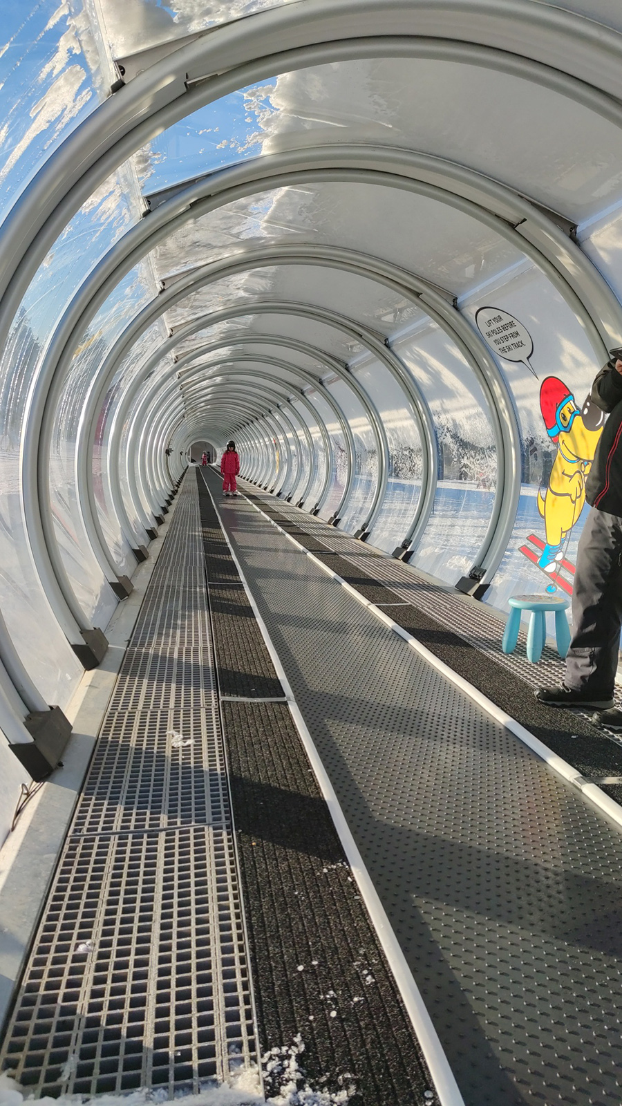 Što mislite, tko se opet nije dao sa skija? Liv, naravno! Totalno je zaboravila da je jučer rogoborila i neumorno je hodala na svojim malim skijama – a posebno odvalila vidjevši tunel! Riječ je o tunelu za baby skijaše i boardaše koji se sastoji od malog stojnog postolja koji te vozi natrag na vrh brijega. Naravno, na do jučer mrskim i neudobnim skijama! Ukratko ću reći da smo stotinjak puta morali ići gore-dolje, gore –dolje, što me koštalo „muških“ bolova u leđima – no naravno, isplatilo se u svakome pogledu, uključujući onaj oko nas samih!