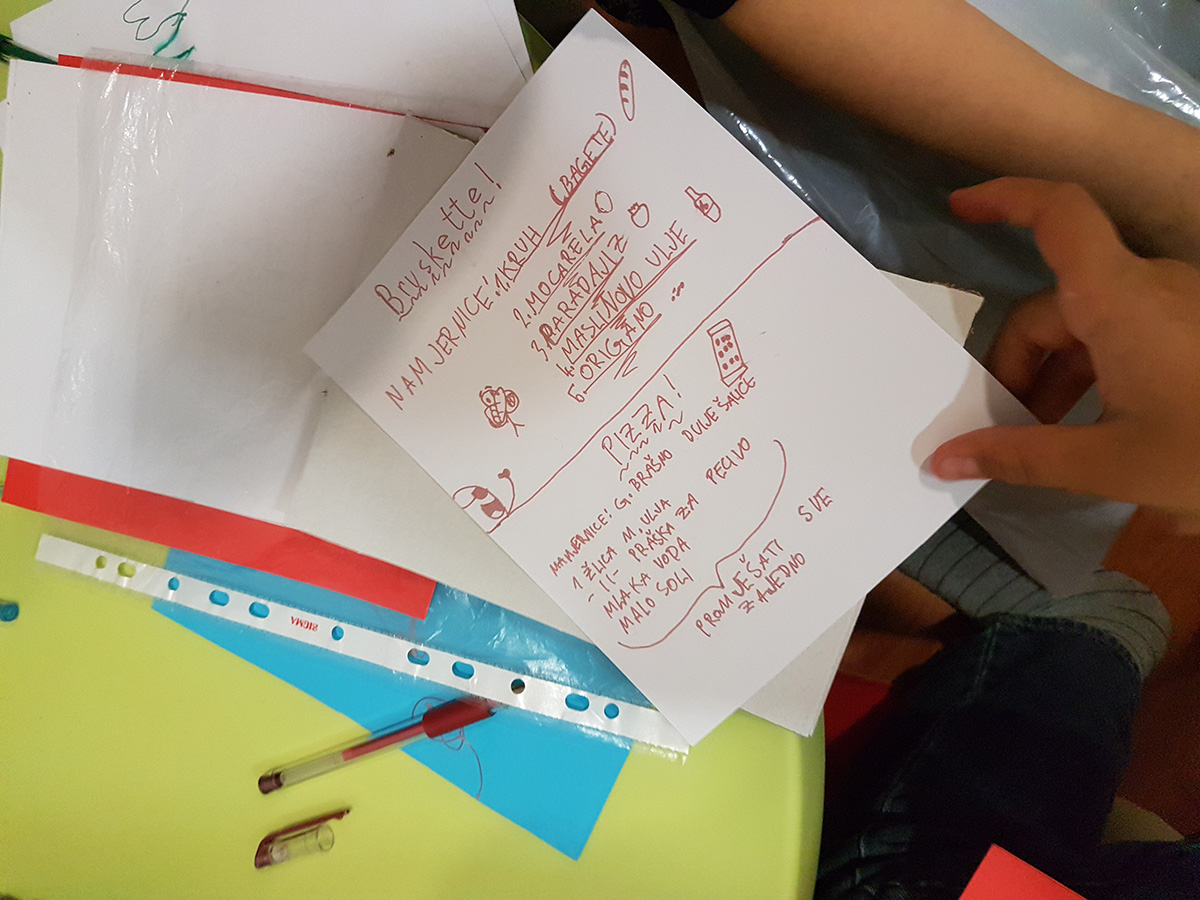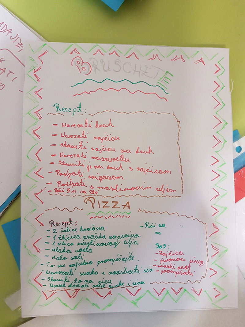 Naučili smo kako tijesto, sir, šunka i gljive zajedno tvore pizzu, što sve sadrži smjesa za sladoled i koliko dugo prave bruschette vole biti u pećnici. Puno smo mijesili, miješali, mazali i lizali prste: imali smo pune ruke posla i pune kape kreativnih ideja. A kad nam prsti nisu trebali za tijesto, kremu ili namaze, zaposlili smo ruke pisanjem i pričanjem.