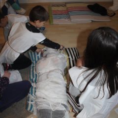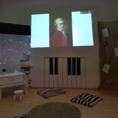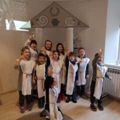 Kleopatra, zagonetna mumija i hijeroglifi – počeli smo s uvijek zanimljivim i misterioznim svijetom drevnog Egipta. Nastavili smo u Rimu, točnije s Cezarom i velikom izdajom na Kapitolu. Čuli smo priču o Romulu i Remu i usput izradili predivni mozaik od kolaža, a nakon napornog dana častili se i nazdravljali baš kao stari Rimljani! Treći dan kampa bio je u znaku velikog Leonarda da Vincija koji nas je, glavom i bradom, zatražio pomoć u potrazi za kradljivcem slike. Otkrivali smo tragove, sastavljali profil kradljivca i naravno – riješili misterij bez po’ muke! A za uzvrat, Leonardo nam je pokazao neke od svojih nacrta prema kojima smo izradili vlastite leteće sprave i svašta nešto. Nakon dojave da se sprema atentat u operi, otputovali smo u 18. stoljeće, u posjet Mozartovom domu u Salzburgu. Ako mislite da je bilo lako spriječiti atentat – varate se! Morali smo naučiti plesati valcer, izraditi svoje perike, napraviti prefine Mozart kuglice (koje su nam pojeli roditelji!) i još smo na kraju izveli svoju verziju opere Čarobna frula! Zadnji dan kampa bio je u znaku krimića Galileo Galilei i prokletstvo astronoma kada smo izradili svoju DIY planetarij lampicu za sobu i „Sunčev sustav u teglici“.