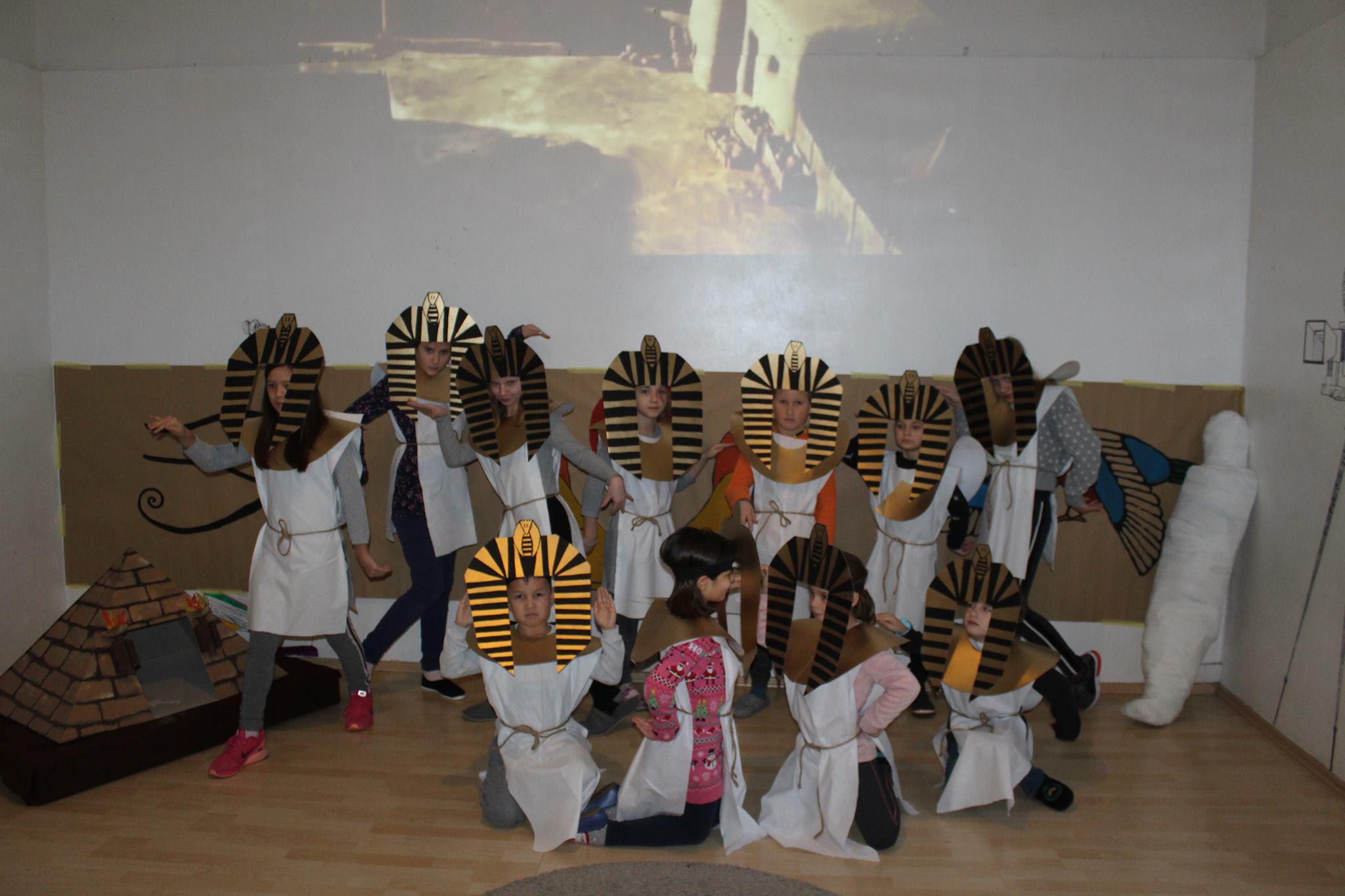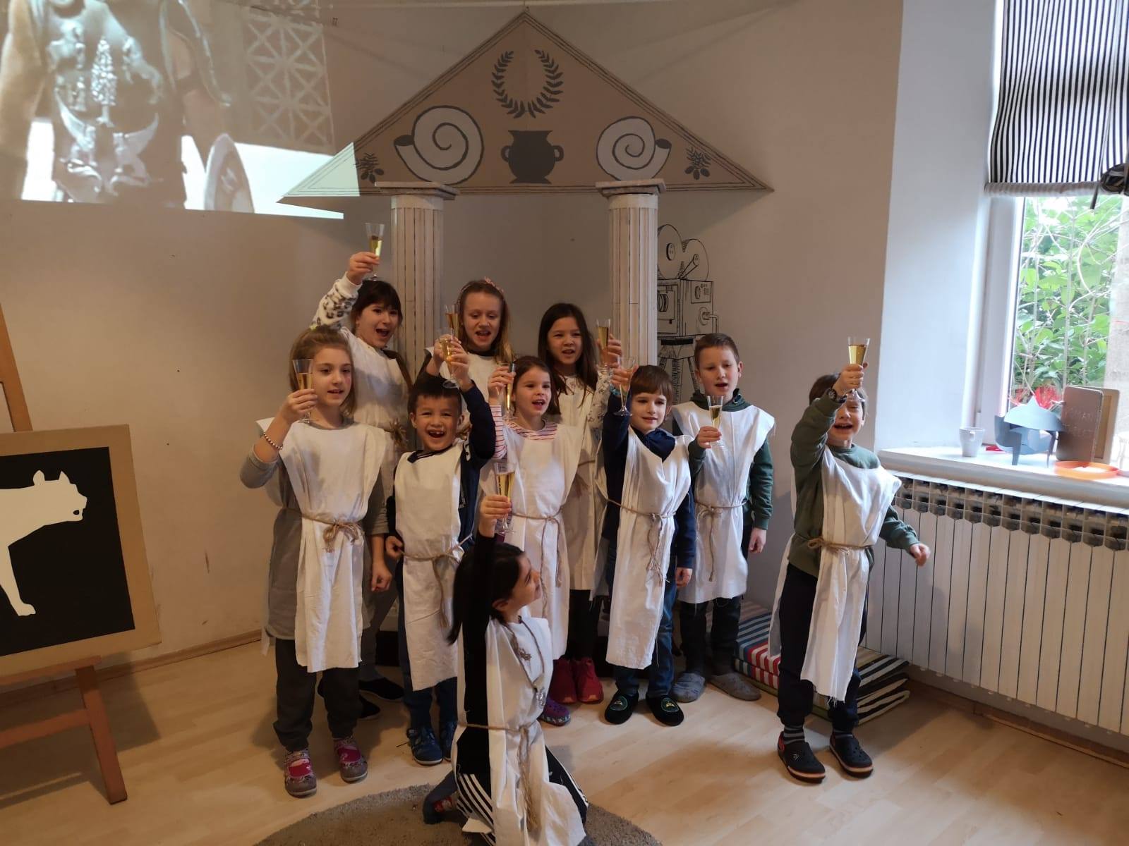 Kleopatra, zagonetna mumija i hijeroglifi – počeli smo s uvijek zanimljivim i misterioznim svijetom drevnog Egipta. Nastavili smo u Rimu, točnije s Cezarom i velikom izdajom na Kapitolu. Čuli smo priču o Romulu i Remu i usput izradili predivni mozaik od kolaža, a nakon napornog dana častili se i nazdravljali baš kao stari Rimljani! Treći dan kampa bio je u znaku velikog Leonarda da Vincija koji nas je, glavom i bradom, zatražio pomoć u potrazi za kradljivcem slike. Otkrivali smo tragove, sastavljali profil kradljivca i naravno – riješili misterij bez po’ muke! A za uzvrat, Leonardo nam je pokazao neke od svojih nacrta prema kojima smo izradili vlastite leteće sprave i svašta nešto. Nakon dojave da se sprema atentat u operi, otputovali smo u 18. stoljeće, u posjet Mozartovom domu u Salzburgu. Ako mislite da je bilo lako spriječiti atentat – varate se! Morali smo naučiti plesati valcer, izraditi svoje perike, napraviti prefine Mozart kuglice (koje su nam pojeli roditelji!) i još smo na kraju izveli svoju verziju opere Čarobna frula! Zadnji dan kampa bio je u znaku krimića Galileo Galilei i prokletstvo astronoma kada smo izradili svoju DIY planetarij lampicu za sobu i „Sunčev sustav u teglici“.