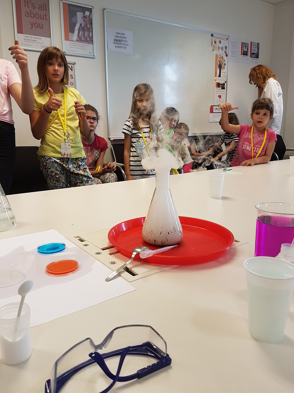 Nakon svih tih važnih poslova, došlo je vrijeme za još malo posla: ovaj put onog koji se skriva iza pitanja što roditelji rade dok rade. Novartisovi klinci već su znali da njihovi roditelji nose bijele kute i mućkaju nešto šareno, reaktivno i znanstveno. A kako to izgleda u praksi: uvjerili smo se sami! U maloj znanstvenoj radionici spajali smo tekućine, bojali boje i stvarali kemijske reakcije: svašta je nastalo iz tog druženja, a najviše odličan provod! Zato jedva čekamo novu priliku da spojimo znanost, igru i obiteljsko druženje. I sve to zasladimo smijehom, pjesmom i kolačem od mrkve!
