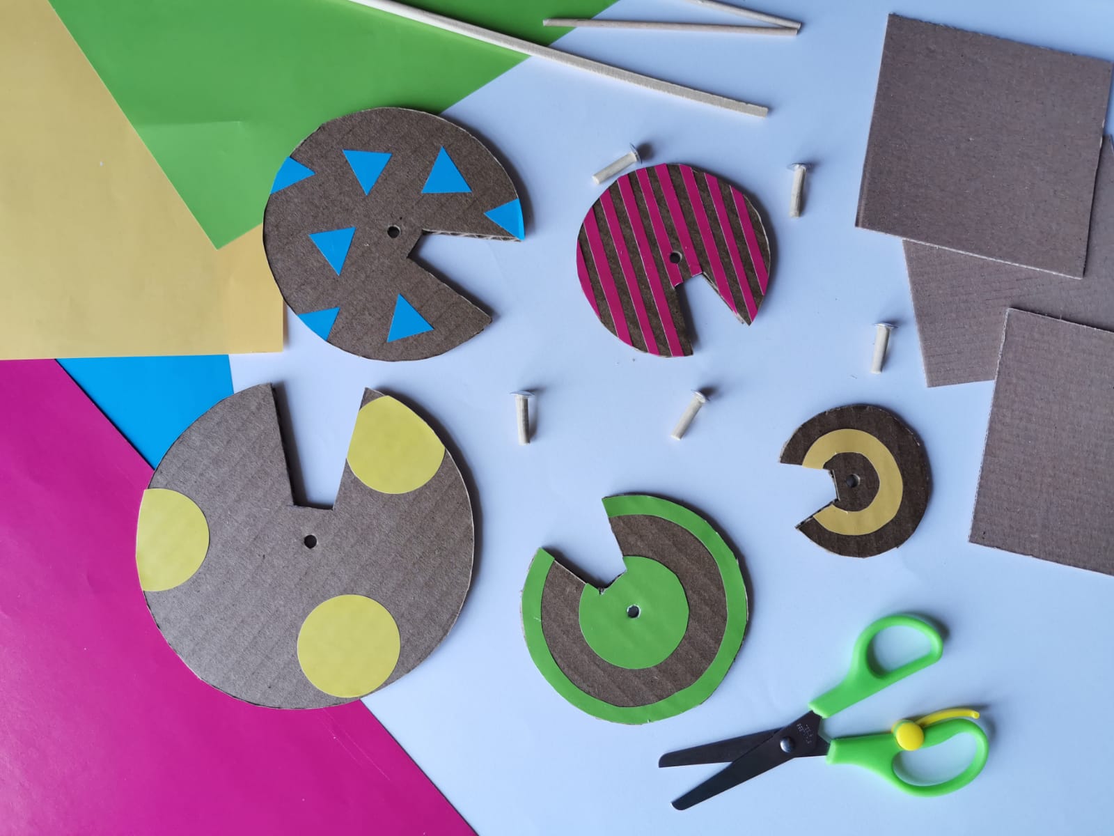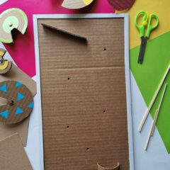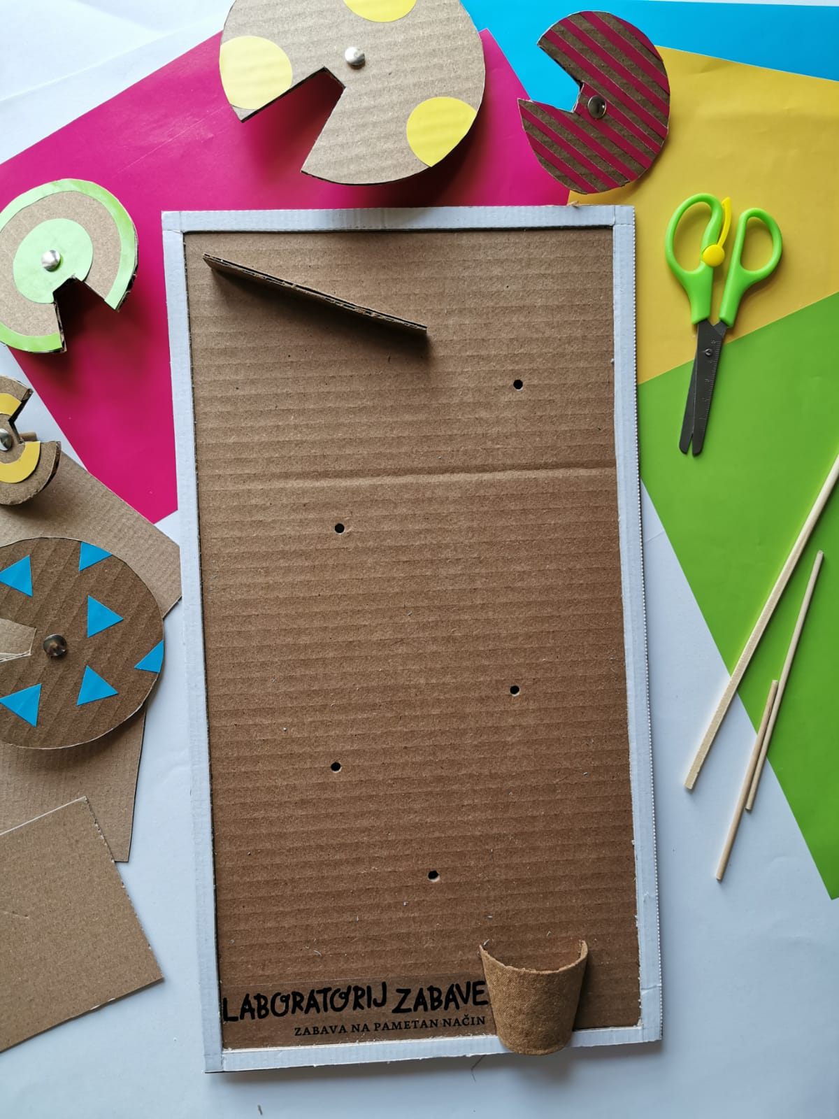 Najprije od kartona izrežite jedan veći pravokutnik. Možete ga malo i ukrasiti, obrubiti ga nekom bojom koja vam se sviđa ili ga pak ostaviti takvog kakav je. Vama na volju. Zatim, opet od kartona, izrežite krugove različitih veličina. Ukrasite ih kako god vam se sviđa – možete ih iscrtati raznim bojama ili ukrase izrezati od papira u raznim bojama. Zatim, na svaki krug napiknite po jedan štapić (skratite štapiće prema potrebi, a možete im napraviti i „glavicu“ od komadića drvene letvice). Kada ste s time gotovi, na svakom krugu izrežite utor, kao što se vidi na našoj slici.