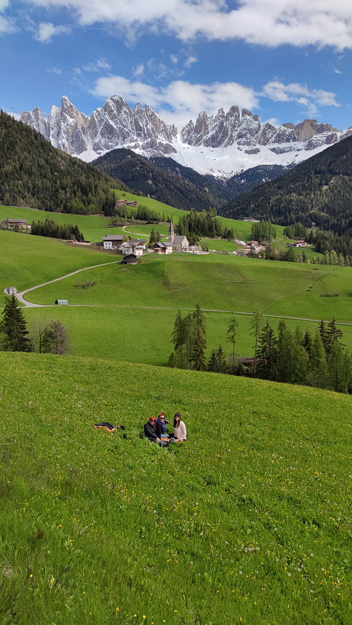 Sve u ime dobrog provoda, popodnevno kretanje prema Zagrebu osmislile smo kao pustolovni road trip po zanimljivim mjestašcima i njihovim ljepotama. Tako smo završile u seocima Val Gardene, dolomitske doline poznate po skijalištima i penjalištima. Još jedno mjesto za ljubitelje prirode! Iz Val Gardene nas je put odveo u Santa Magdalenu i tu dolazimo do naše frendice Mateje. Naime, još dok pojma nije imala da će nam se pridružiti na putu, Matea je slučajno na Internetu nabasala na panoramu Santa Magdalene i ostala paf nad pogledom u ekran. Toliko se zaljubila u njega da je odlučila kad tad otići ondje, ma gdje se to mjesto nalazilo. Tek kasnije smo shvatili da je na našem putu do Bolzana i odluka je bila jednoglasna – Matea, ideš s nama! Pogled kojeg vidite na slici uživo je još ljepši i zeleniji, a ništa manje krasna nije šetnja do njega. Sastoji se od ugodnih 40 minuta po laganoj i popločenoj stazi zahvalnoj za noge i dječja kolica, dok oko tebe slobodno i spontano šeću krave, koze, ovce i ostale domaće životinje. Mi kažemo – super obiteljska šetnja u kojoj će klinci uživati punim plućima! Što od čistog zraka, a što od pustolovina!